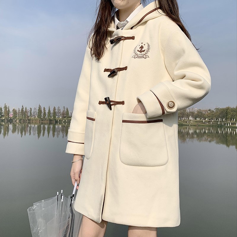 韩系连帽中长款毛呢外套女冬装新款初高中学生牛角扣夹棉呢子大衣