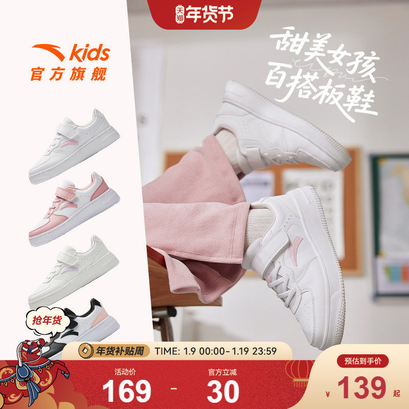 安踏儿童小白鞋低帮板鞋女童运动鞋春秋新款学生白色滑板鞋休闲鞋