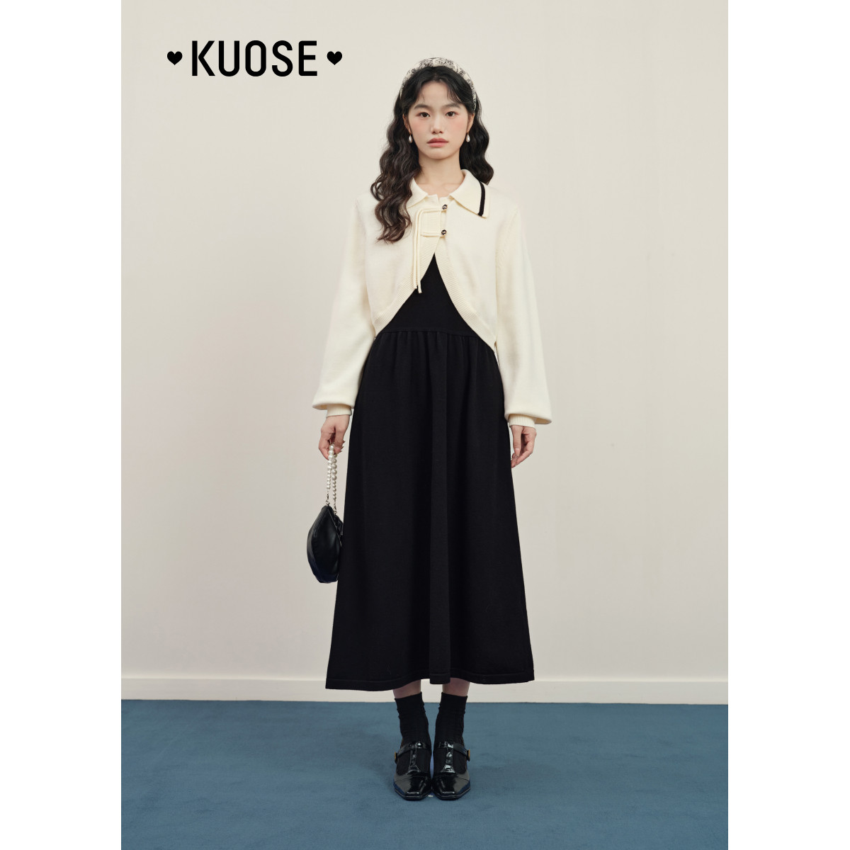 法式温柔风奶系穿搭毛衣针织连衣裙套装春秋开衫吊带长裙两件套女