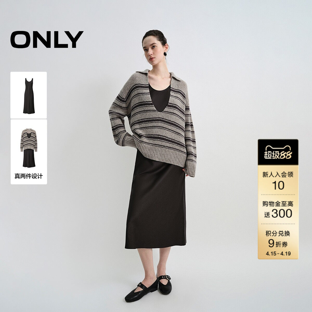 【ONLY奥莱】春季深V翻领针织衫垂坠丝滑A字中长裙套装连衣裙女