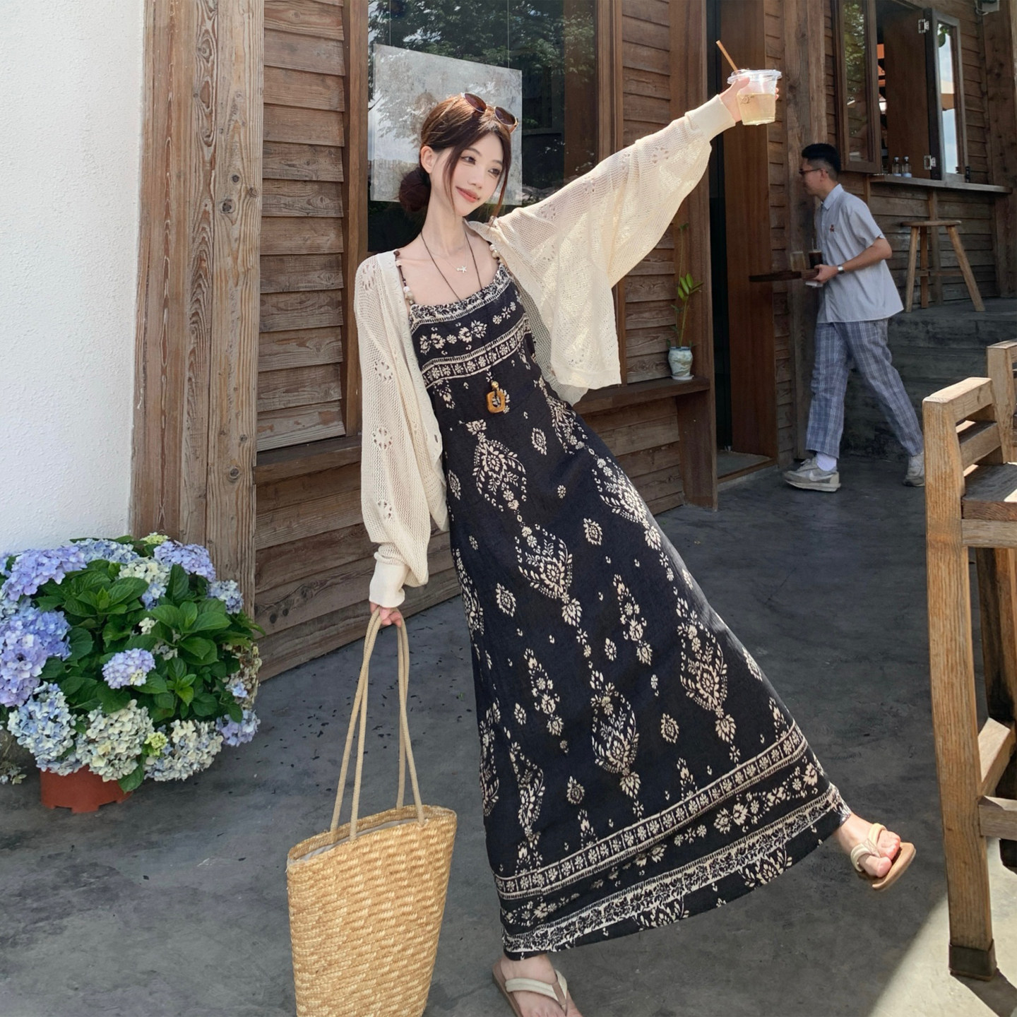 民族风云南旅游穿搭复古黑色碎花吊带连衣裙长裙针织开衫两件套装