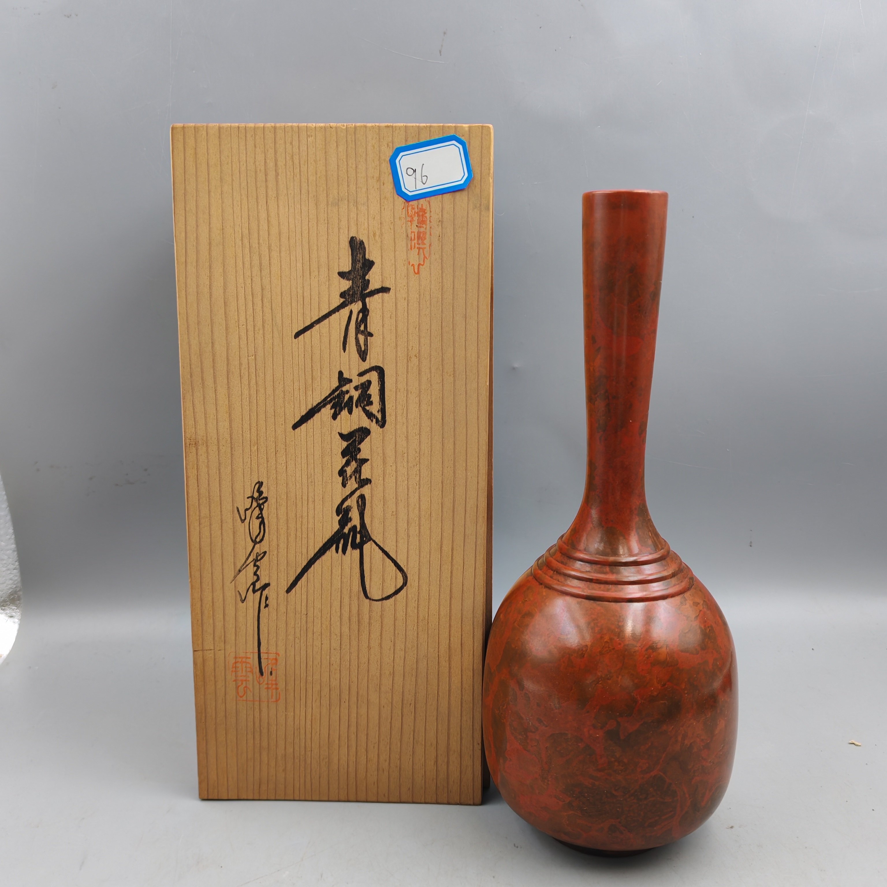 日本产带款老铜花瓶,高24厘米,口径3厘米,带木盒,品相如图。