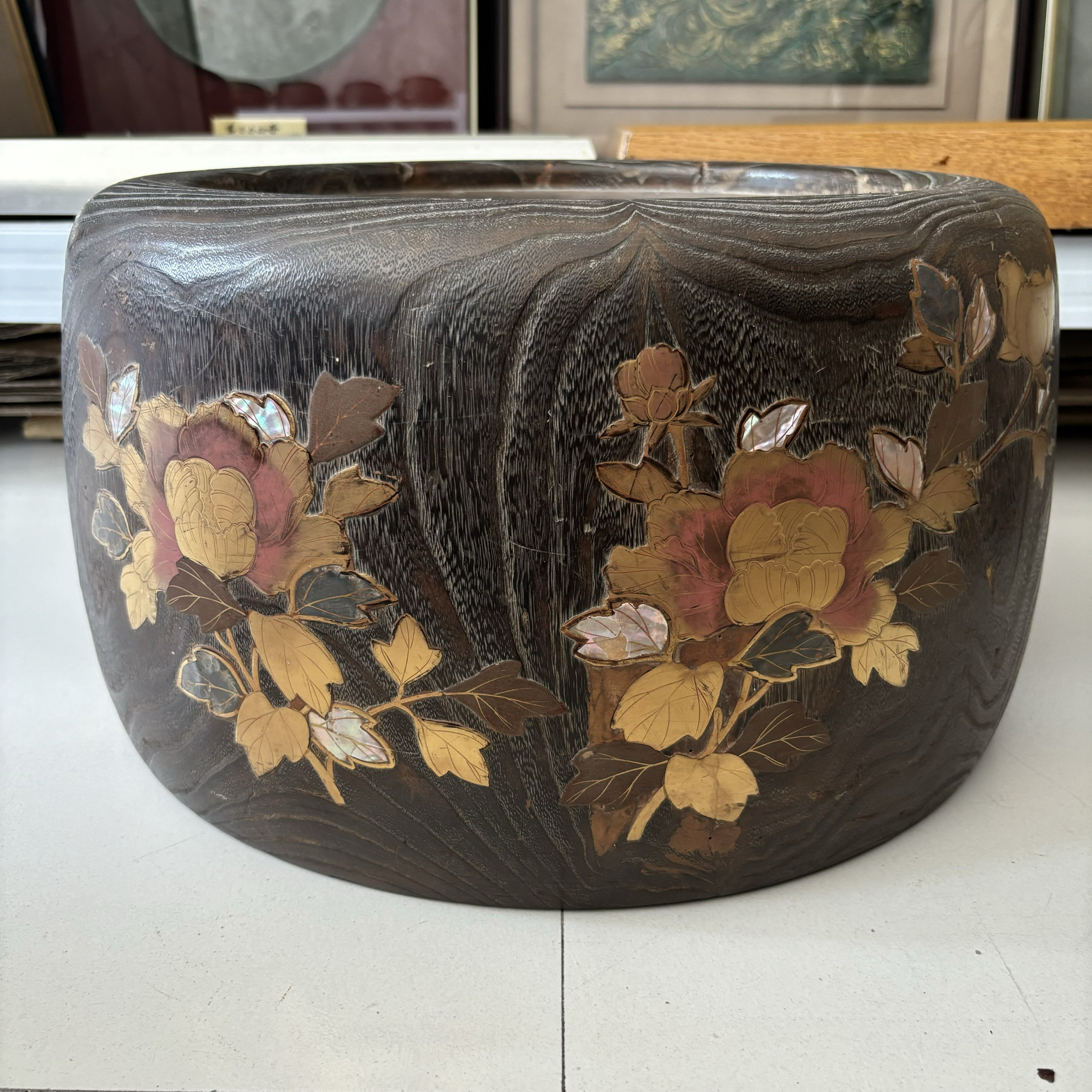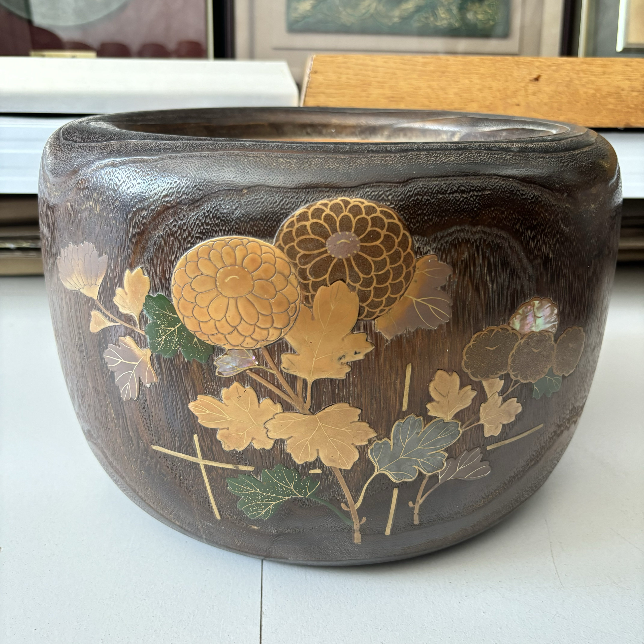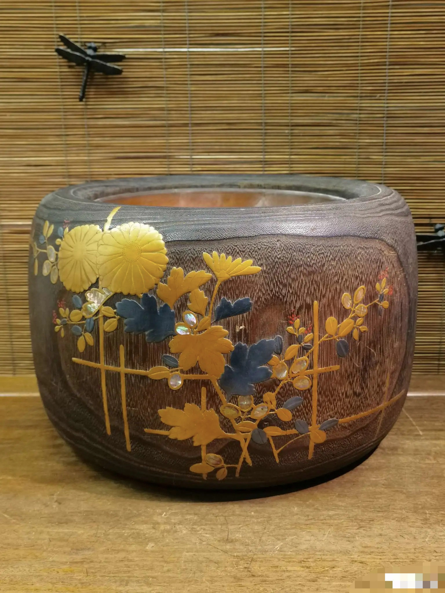 日本老桐木铜胆金时绘嵌螺钿火钵,外径42厘米,铜胆内径29高24