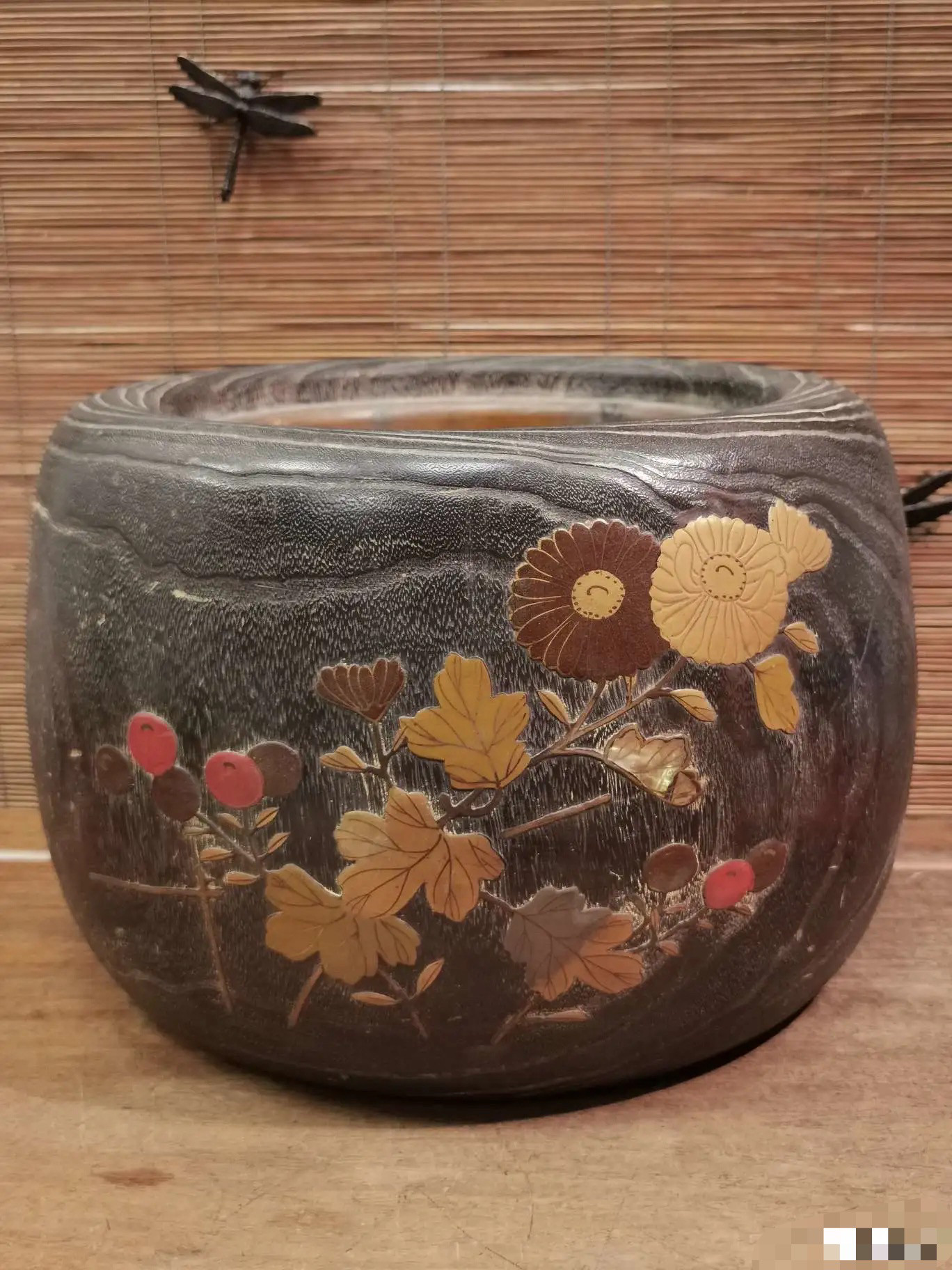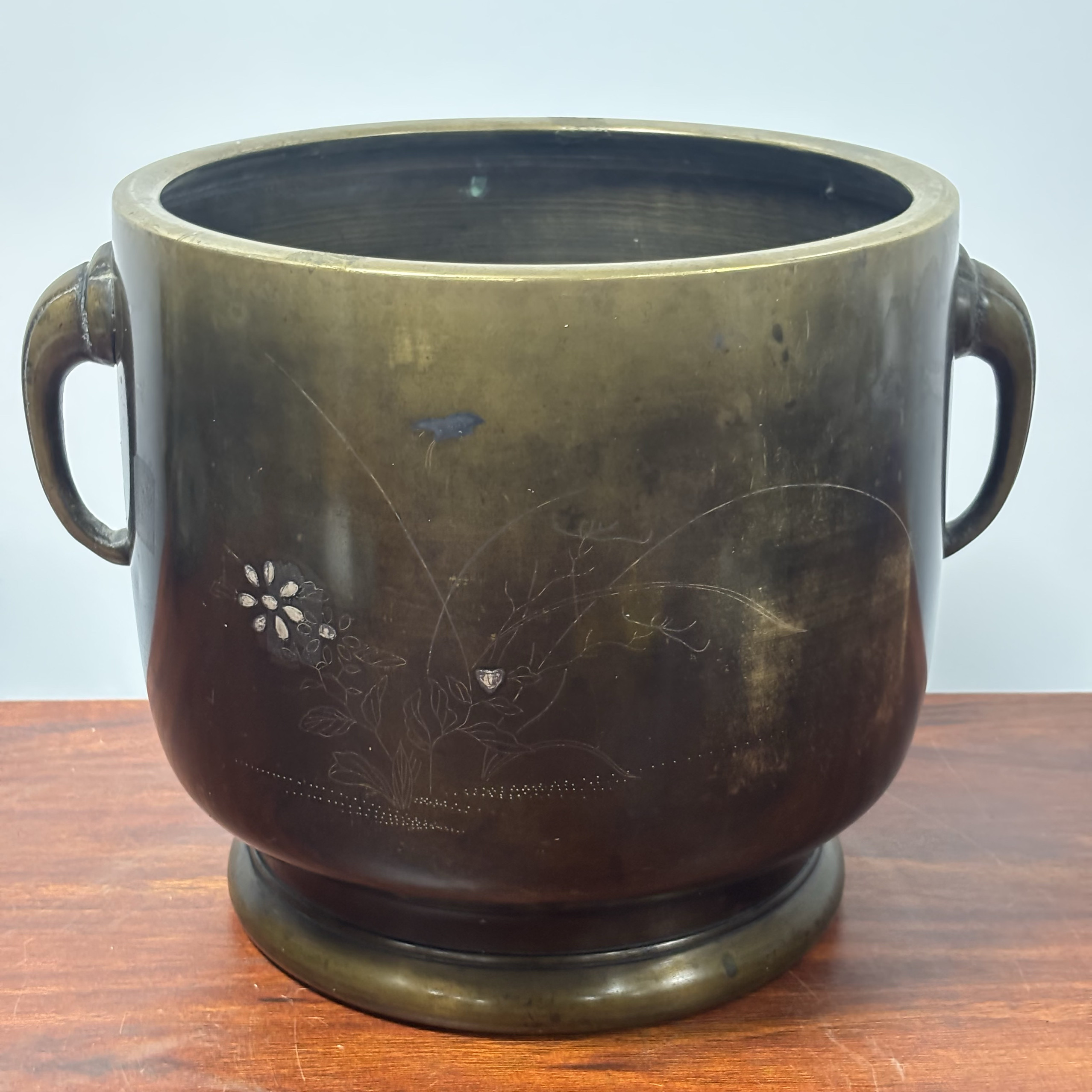日本嵌银花鸟图老铜火钵,重3.4千克,外径25.5厘米,高24厘米