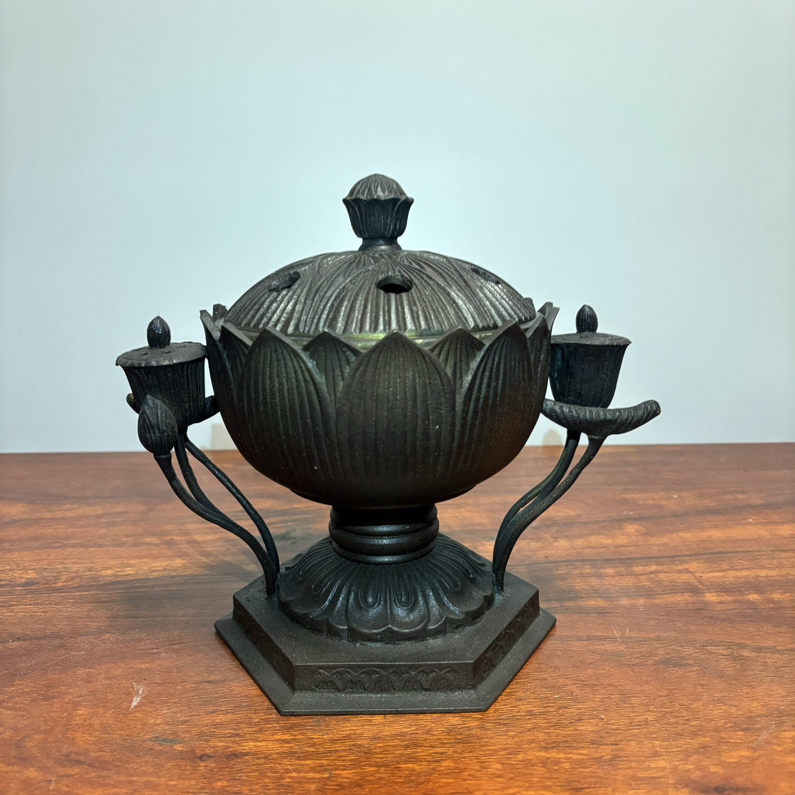 日本老铜莲花香炉,重3.32千克,高21厘米宽23厘米, 年代希少品