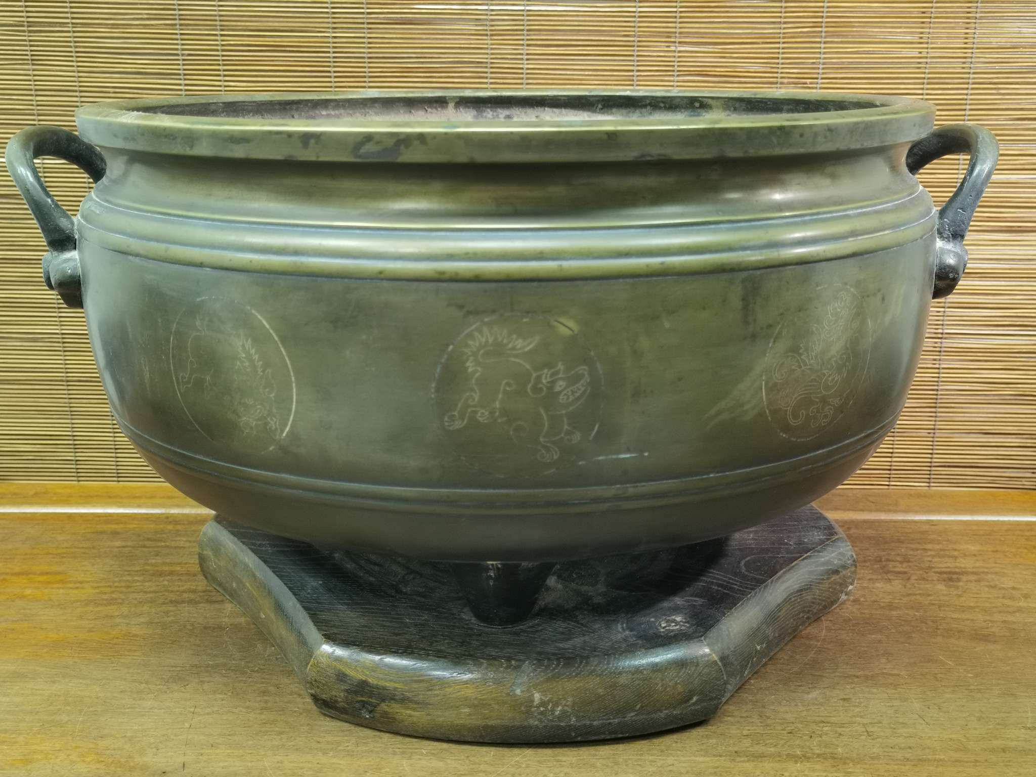 日本老铜嵌银纹路火钵,重5.98公斤,高25厘米外径29厘米内径26