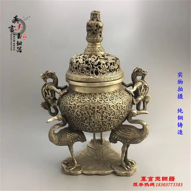 白铜鹤足双龙戏珠香炉薰香炉摆件盘香炉 家居装R饰仿古道具老银器