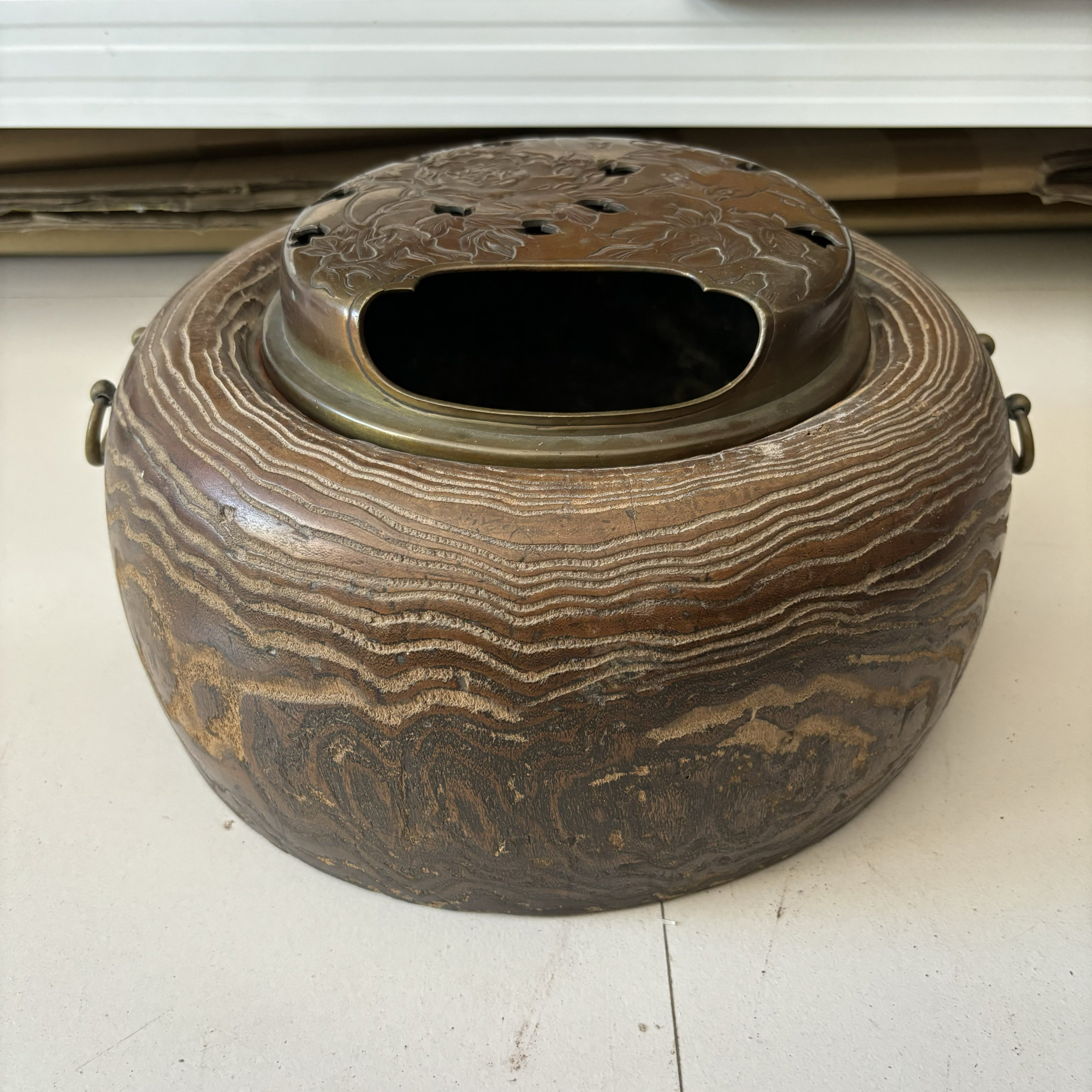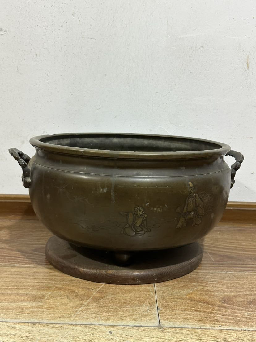 日本产嵌银图案老铜火钵,重9.3千克,外径43厘米,高26厘米。