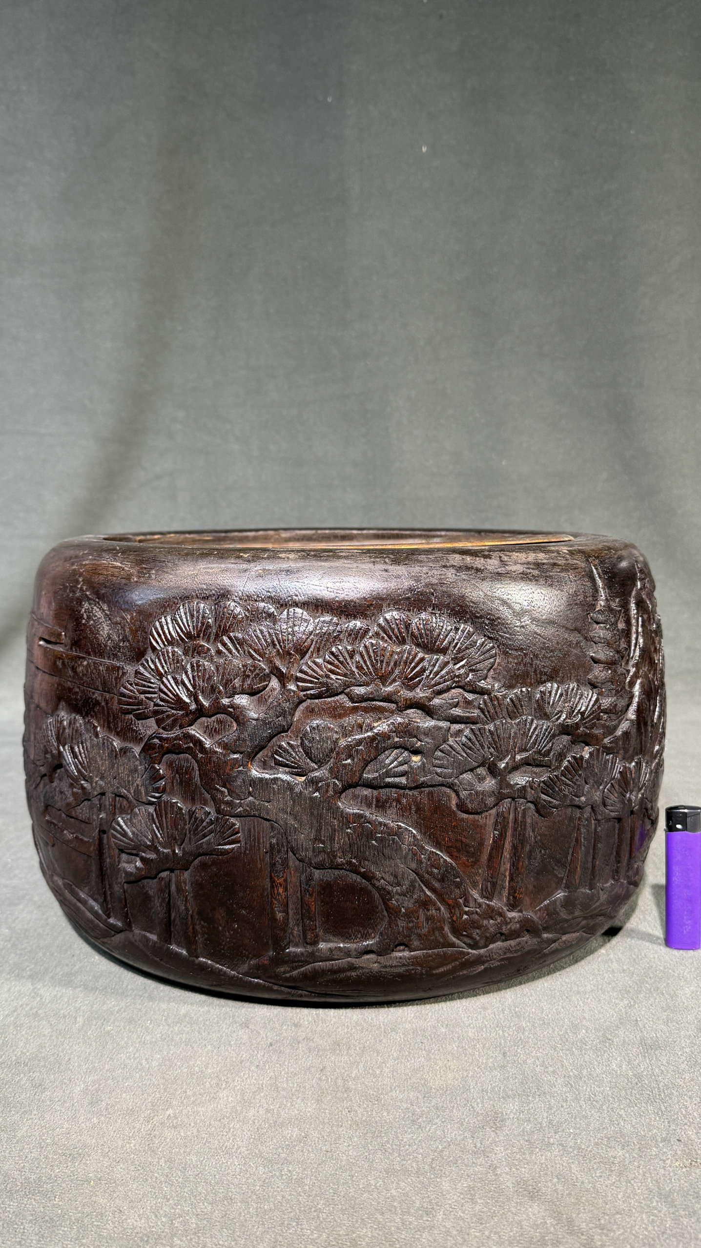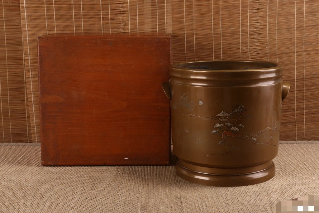 日本老桐木浮雕风景画铜胆火钵,外径37厘米,铜胆内径26高24厘米