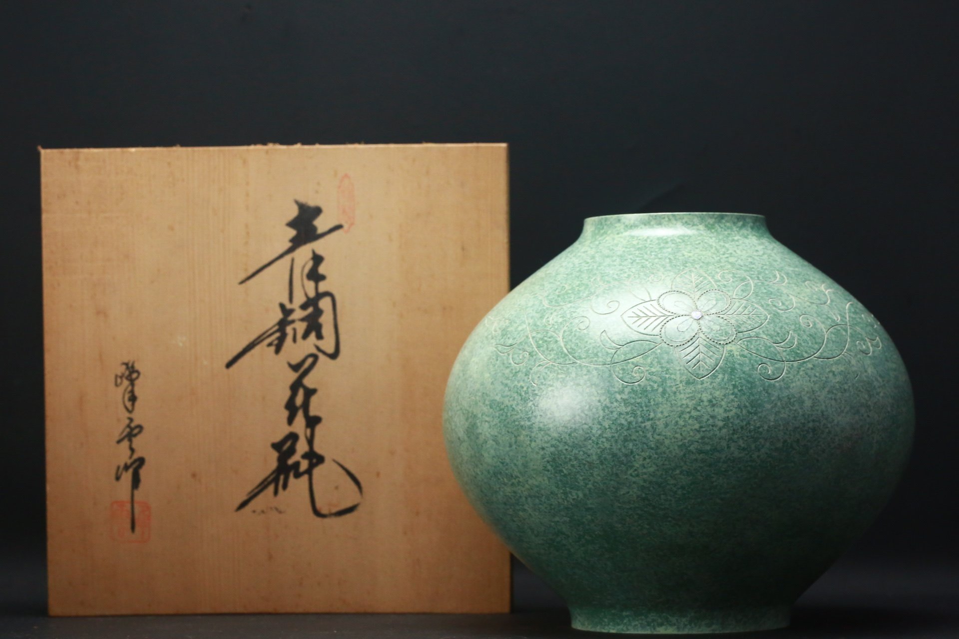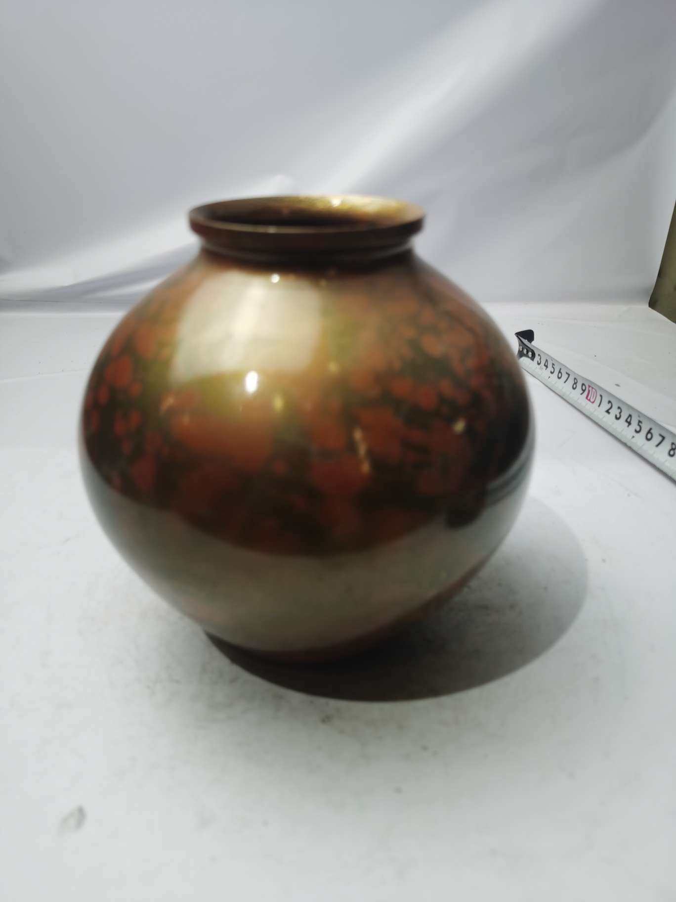 日本峰云作老铜花瓶一个,重3.02千克,高22厘米,肚径22厘米。