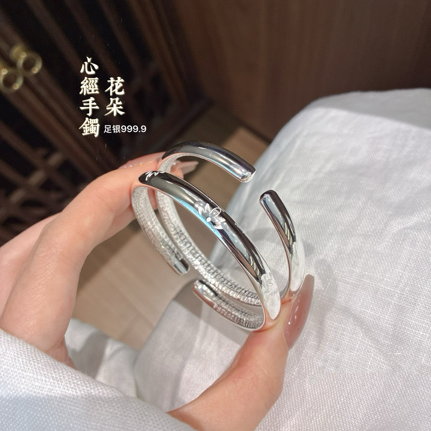 胜银·如意花朵内心经足银9999手镯亮面开口实心送中老年礼物银镯