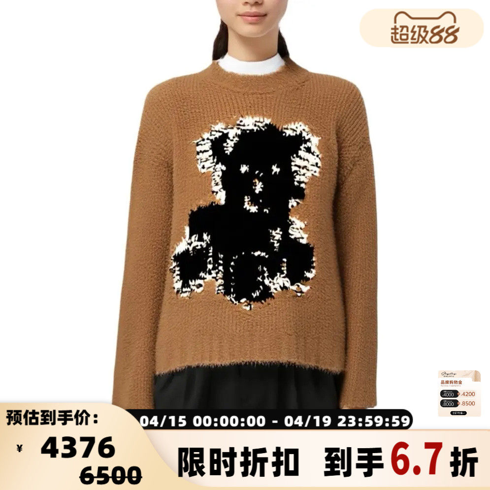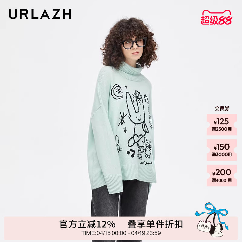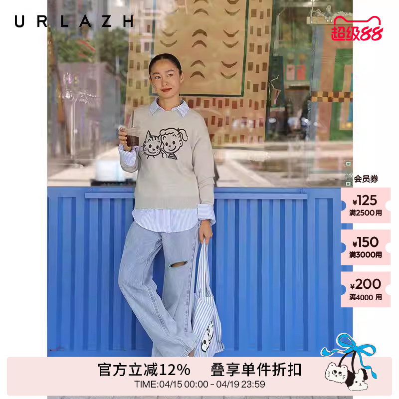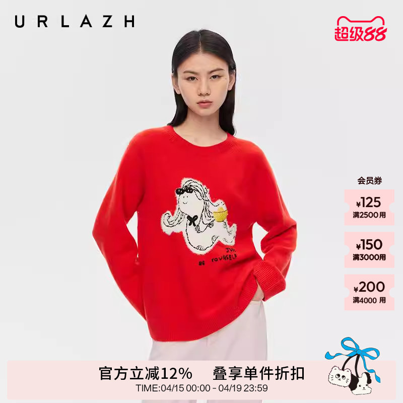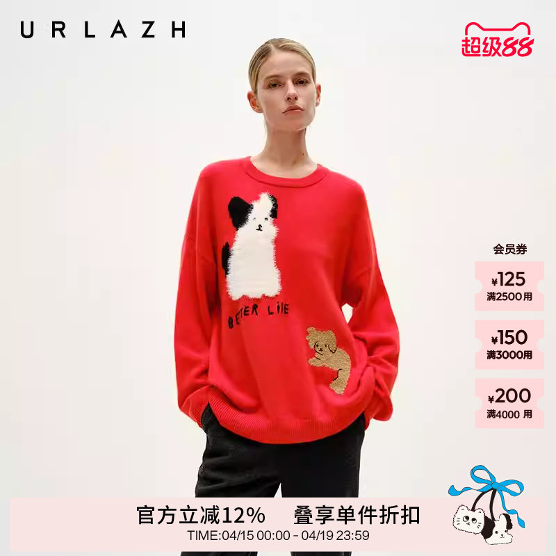 URLAZH有兰冬季新款萌趣狗狗聚会圆领落肩羊绒针织套头长袖毛衣女