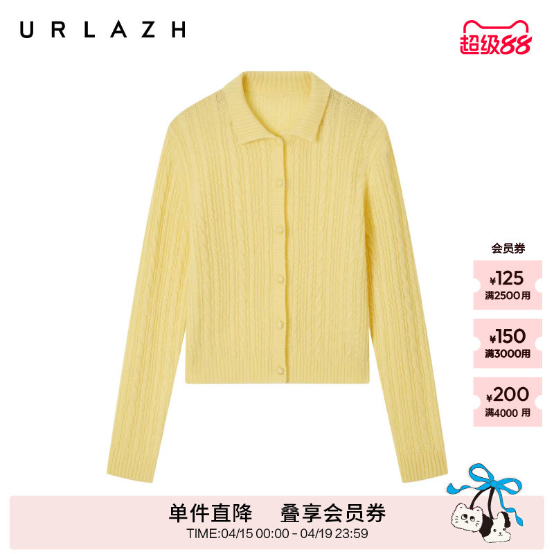URLAZH有兰冬季新款复古风奶黄色绞花翻领短款羊绒针织开衫毛衣女