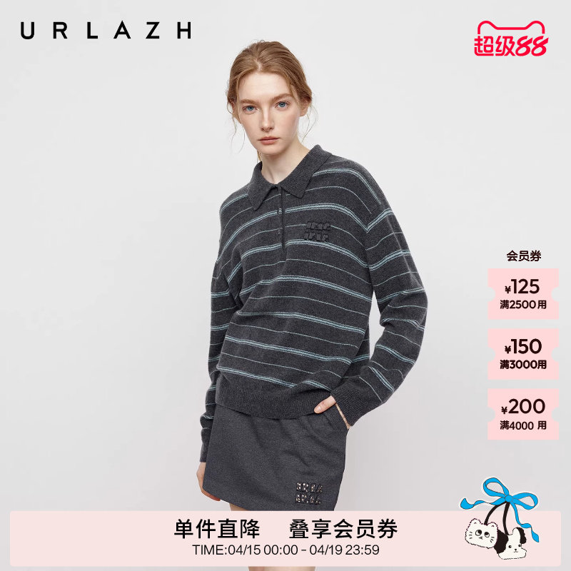 URLAZH有兰秋季新款复古学院风条纹半开襟polo领减龄毛衣羊毛衫女