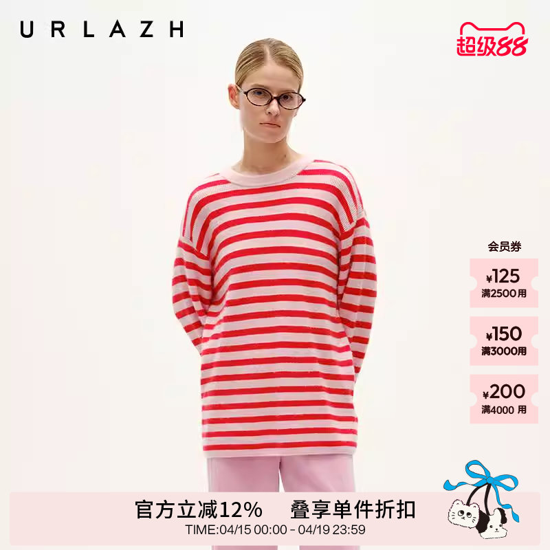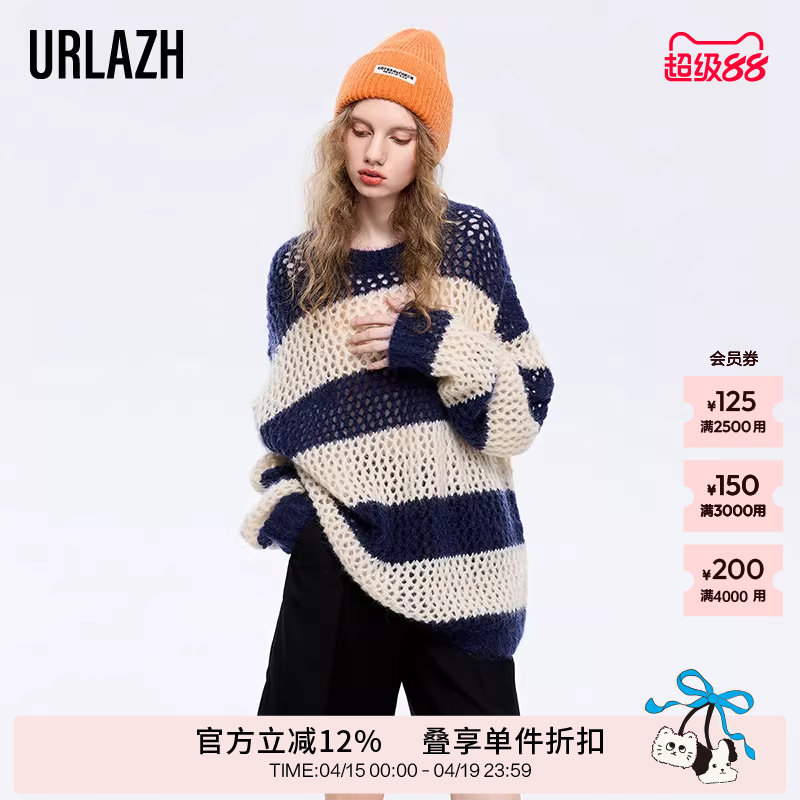 URLAZH有兰春秋新款洋气轻薄镂空宽松气质圆领条纹针织毛衣女