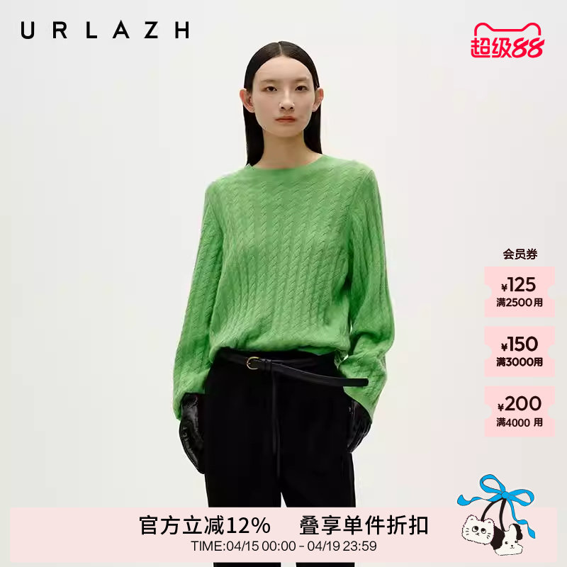 URLAZH有兰冬季新款慵懒风清新绿轻体日宽松圆领绞花羊绒毛衣女
