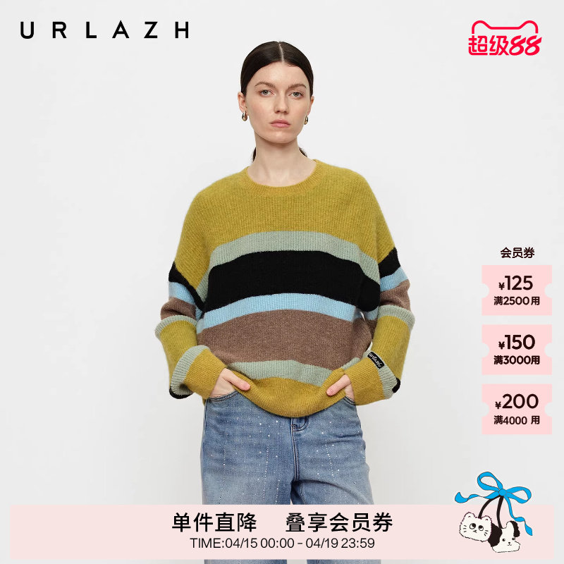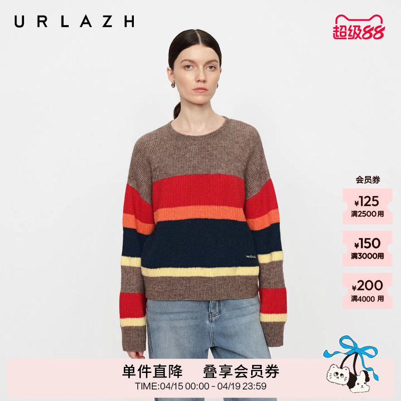 URLAZH有兰冬季新款慵懒松弛感复古撞色条纹圆领羊驼毛针织毛衣女