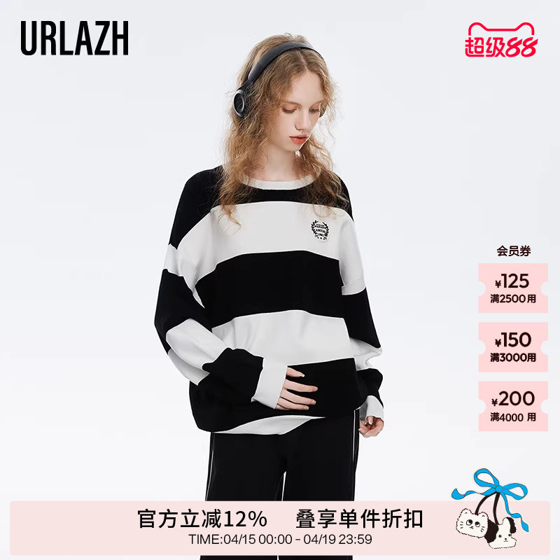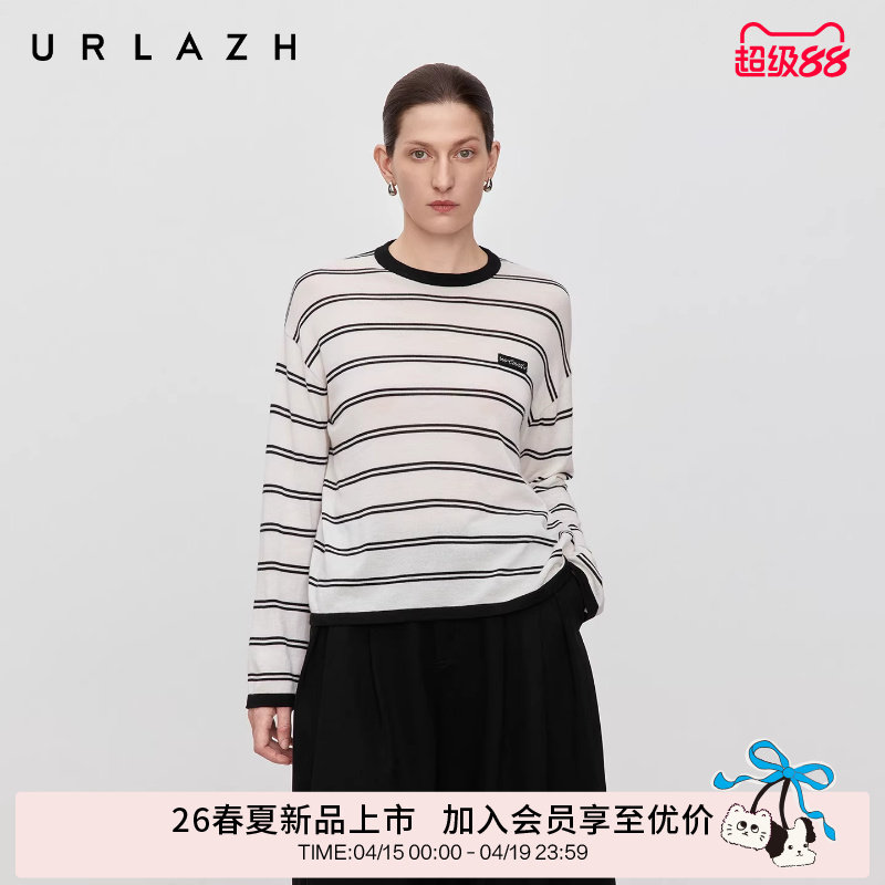 商场同款URLAZH有兰2026春季新款黑白条纹圆领宽松美丽诺羊毛衫女
