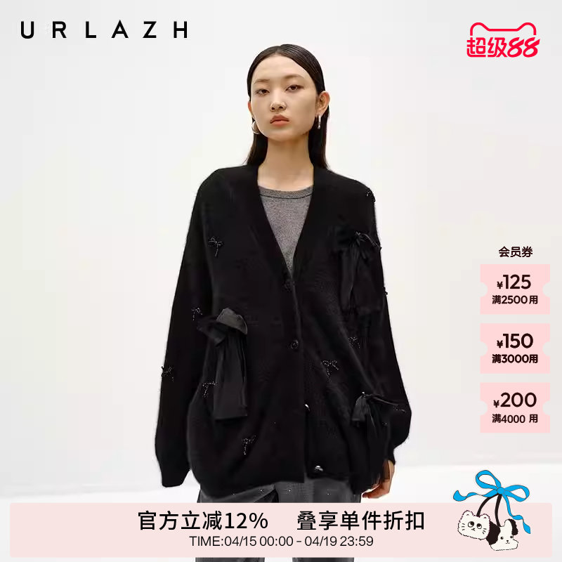 URLAZH有兰冬季新款经典黑V领蝴蝶结休闲羊毛针织开衫毛衣外套女