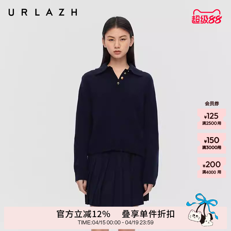 URLAZH有兰春季新款复古学院风藏青色半开襟polo领纯羊毛衫毛衣女