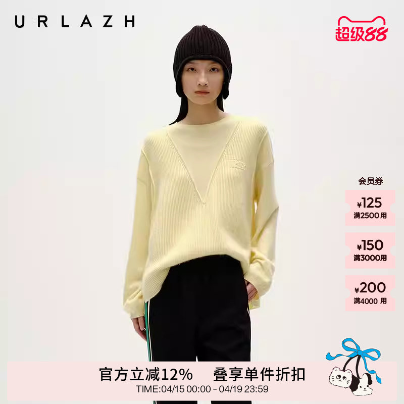 URLAZH有兰冬季新款糯米黄休闲圆领假两件软糯针织羊绒套头毛衣女