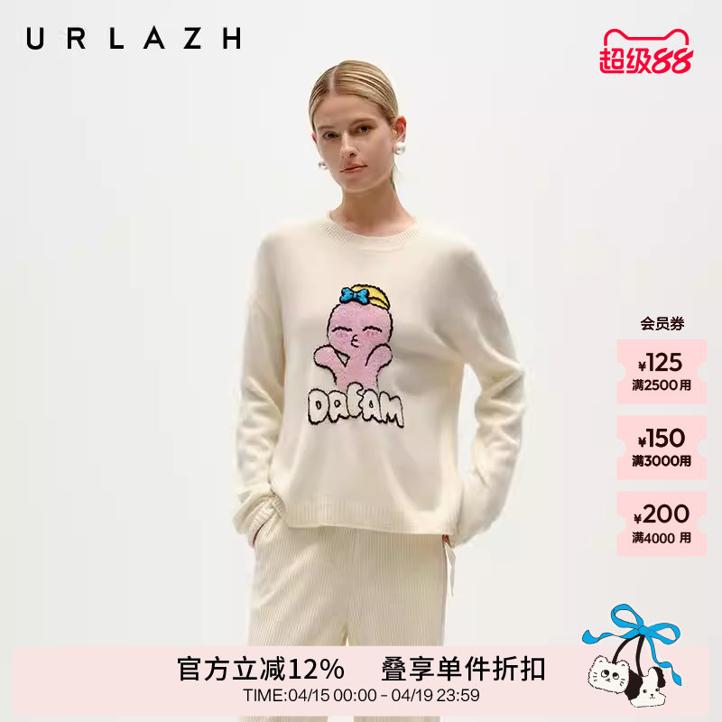 URLAZH有兰冬季新款米白色萌趣亲亲龙圆领宽松羊绒针织套头毛衣女