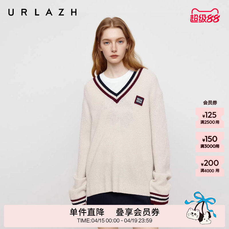 URLAZH有兰秋季新款复古学院风撞色条纹V领落肩宽松毛衣羊毛衫女
