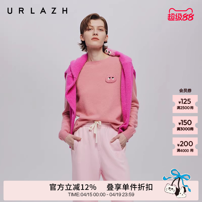 URLAZH有兰秋季新款慕斯粉猫咪贴布绣百搭圆领羊绒休闲长袖毛衣女