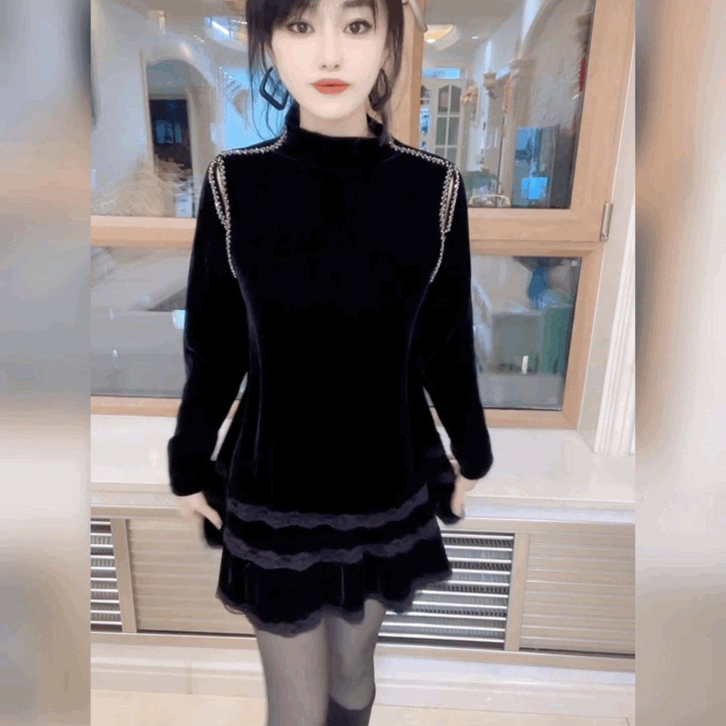 半高领露肩花边赫本风A字裙小黑裙打底裙子中长款金丝绒连衣裙女
