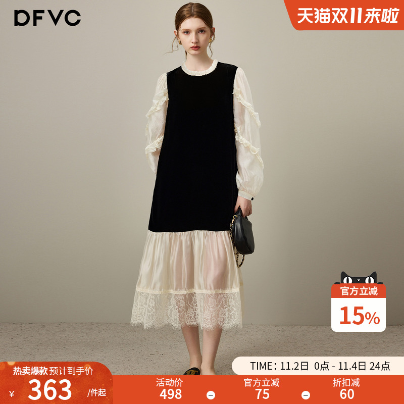 dfvc黑色人丝丝绒长袖连衣裙女2025年秋季新款网纱拼接法式风长裙