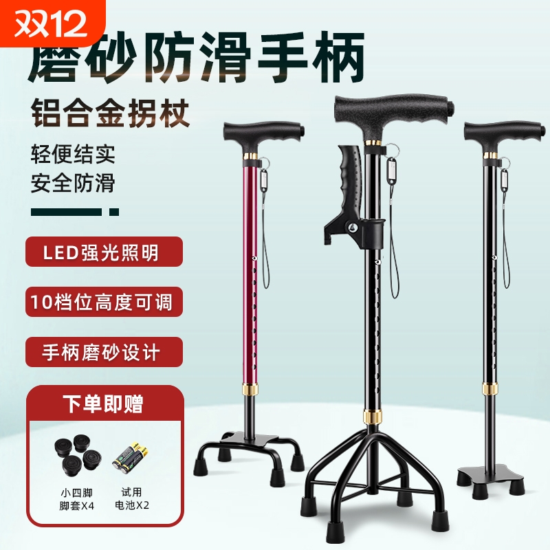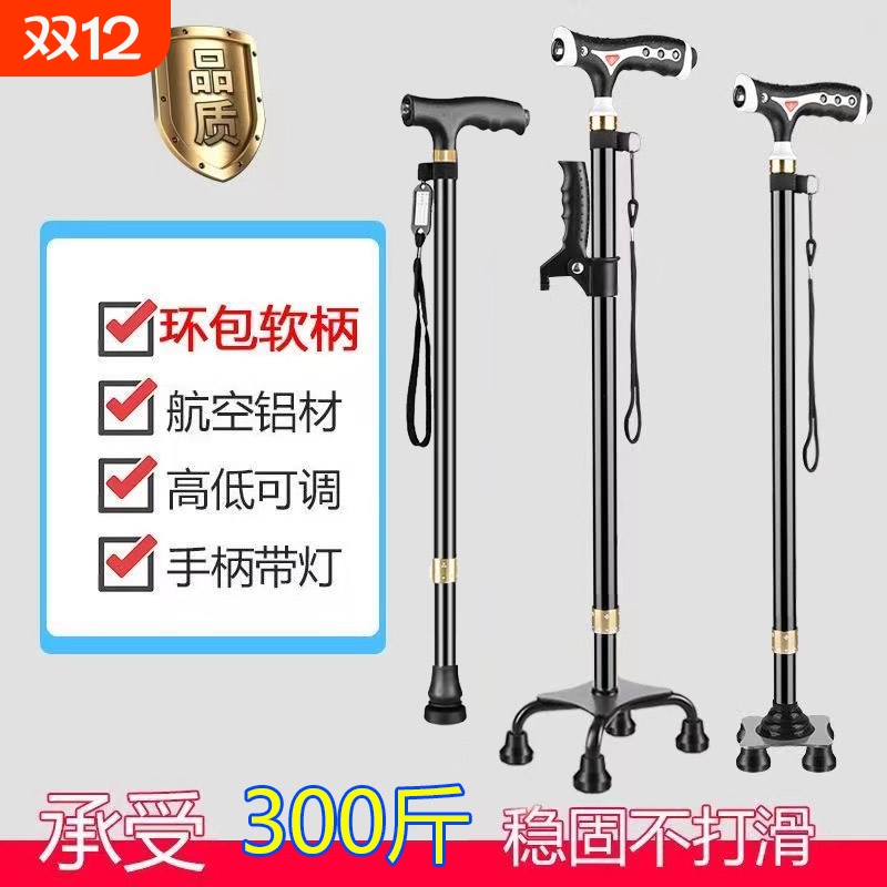 老人拐杖老年人专用拐棍四脚轻便防滑手杖防摔倒拐杖伸缩带灯登山