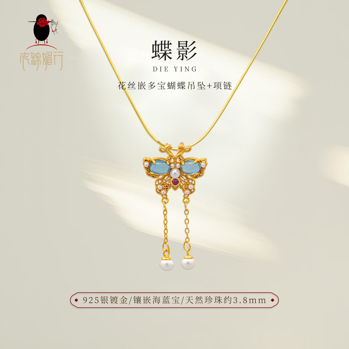 衣锦媚行 925银镀金镶宝花丝蝴蝶流苏吊坠项链挂坠新中式配饰高级