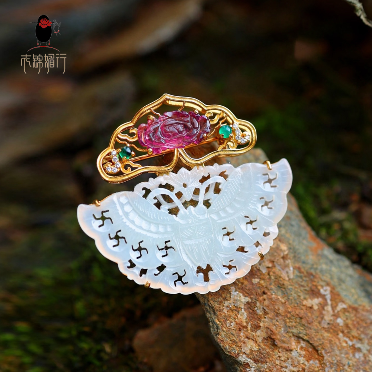 衣锦媚行原创设计s925银镀金和田玉万字纹蝴蝶吊坠新中式复古宫廷