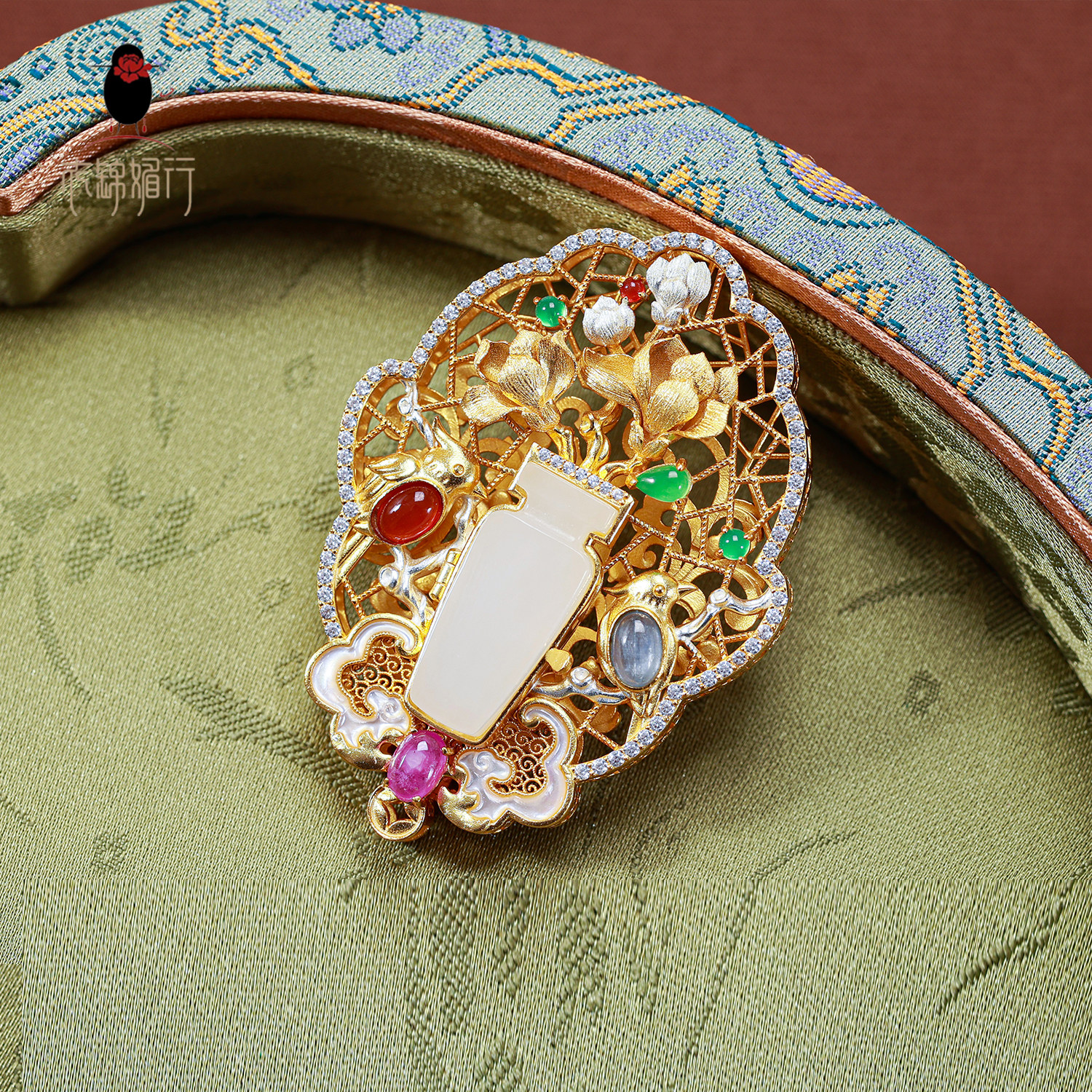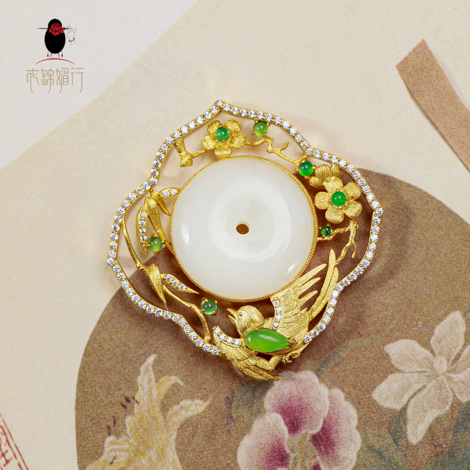 衣锦媚行原创设计s925银镀金和田玉翡翠花瓶窗花双面吊坠复古宫廷