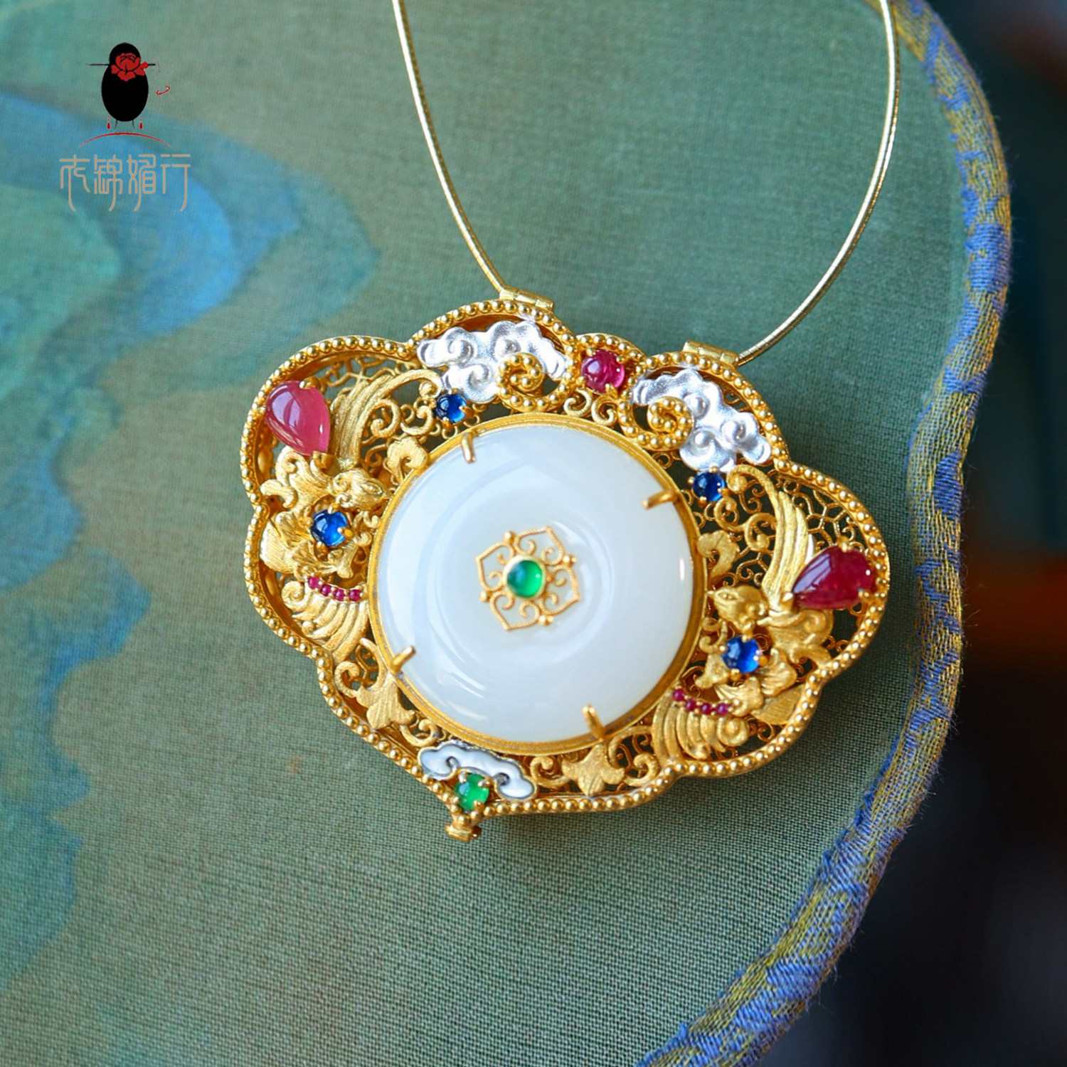 衣锦媚行原创设计s925银镀金花丝凤凰牡丹和田玉香囊吊坠复古宫廷