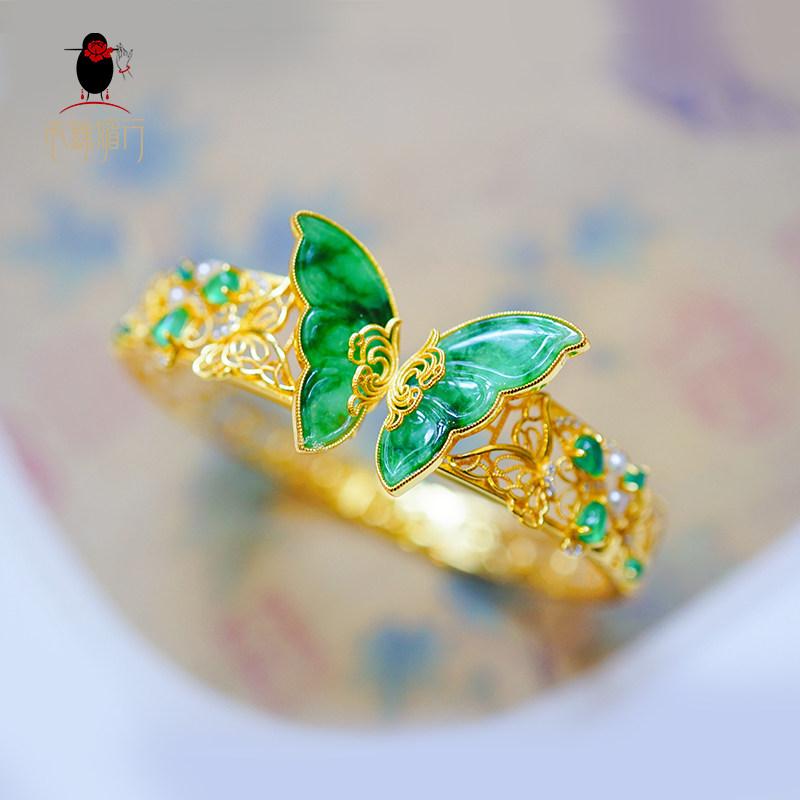 衣锦媚行原创设计高端珠宝翠蝶s925银镀金镶天然翡翠蝴蝶镂空手镯