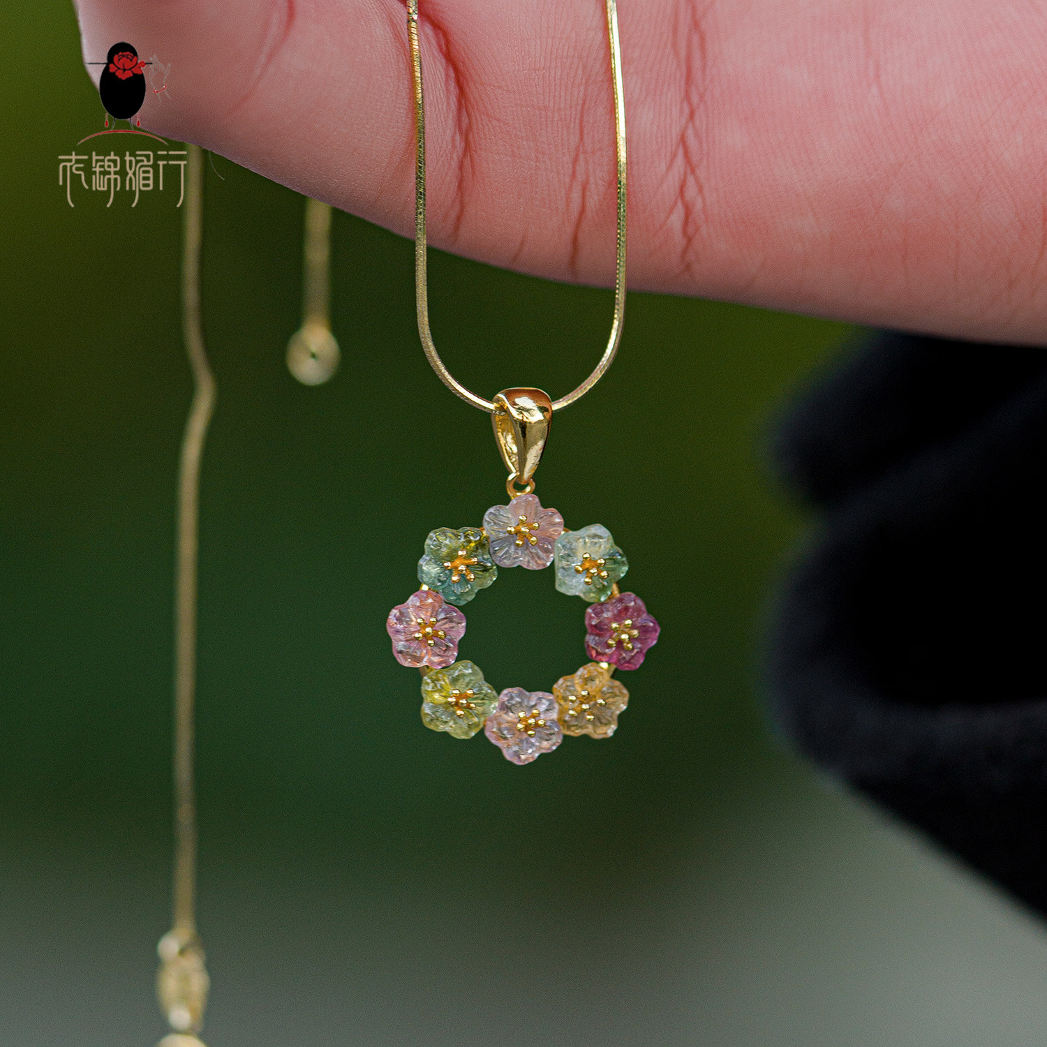 衣锦媚行原创设计s925银镀金碧玺花朵吊坠新中式国风挂坠百搭提溜