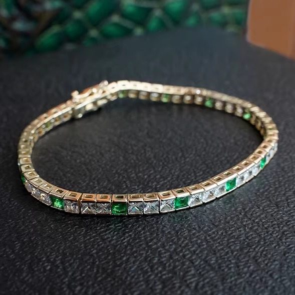 推荐祖母绿色轨道镶通体925银鎏金银手链古董设计华丽丽典雅贵气