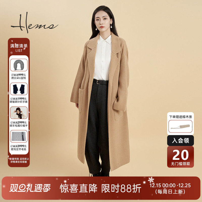 海尔曼斯26支2股定纺羊毛针织长款廓形大衣外套翻领开衫D4940D4R