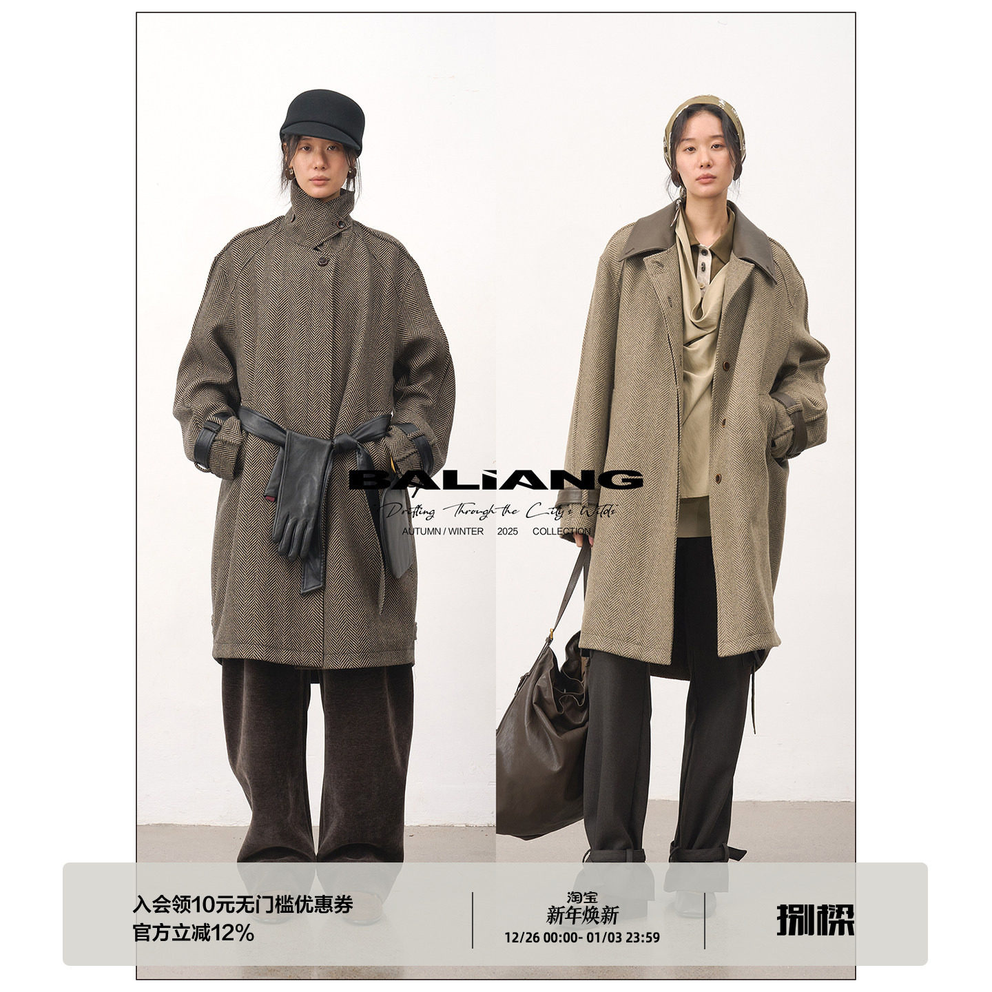 BALIANG「捌樑」 脊'spine' 羊毛混纺人字纹皮领茧型廓形大衣外套