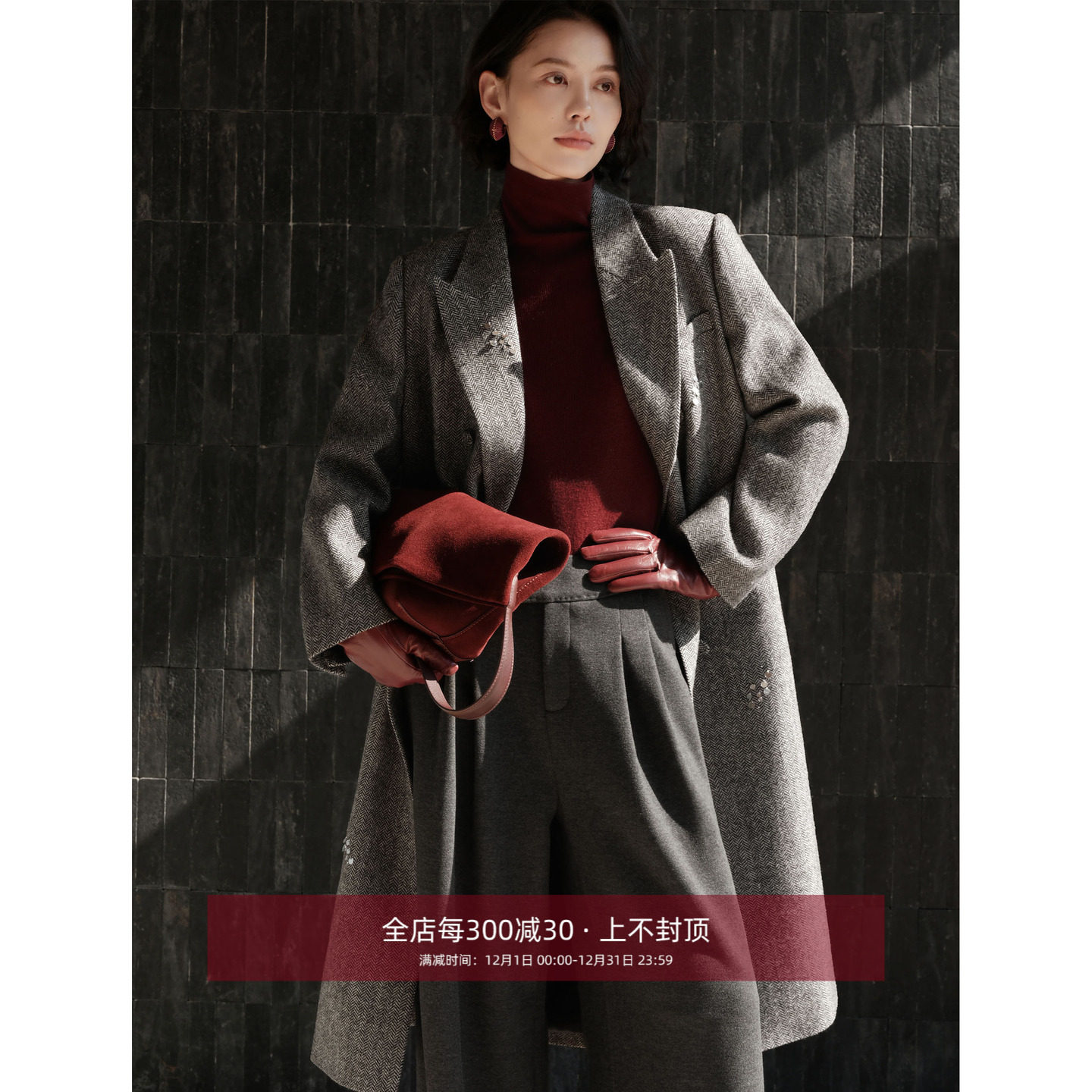 芝美日禾 都市画报 100%全羊毛手工定位珠绣秋冬长款廓形大衣外套