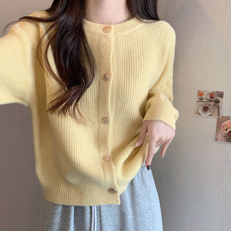 2025冬季新款简约风低圆领纯色单排扣长袖短款针织开衫女XRJ6M11D