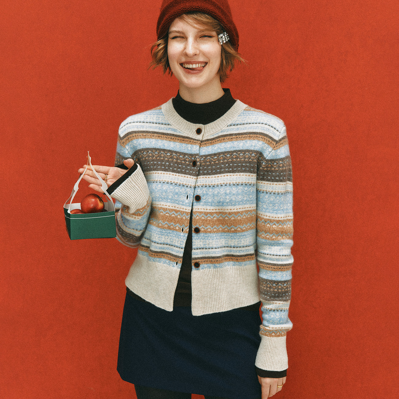 【挪威森林】费尔岛提花 1OO%羊毛圆领长袖短款针织开衫上衣女
