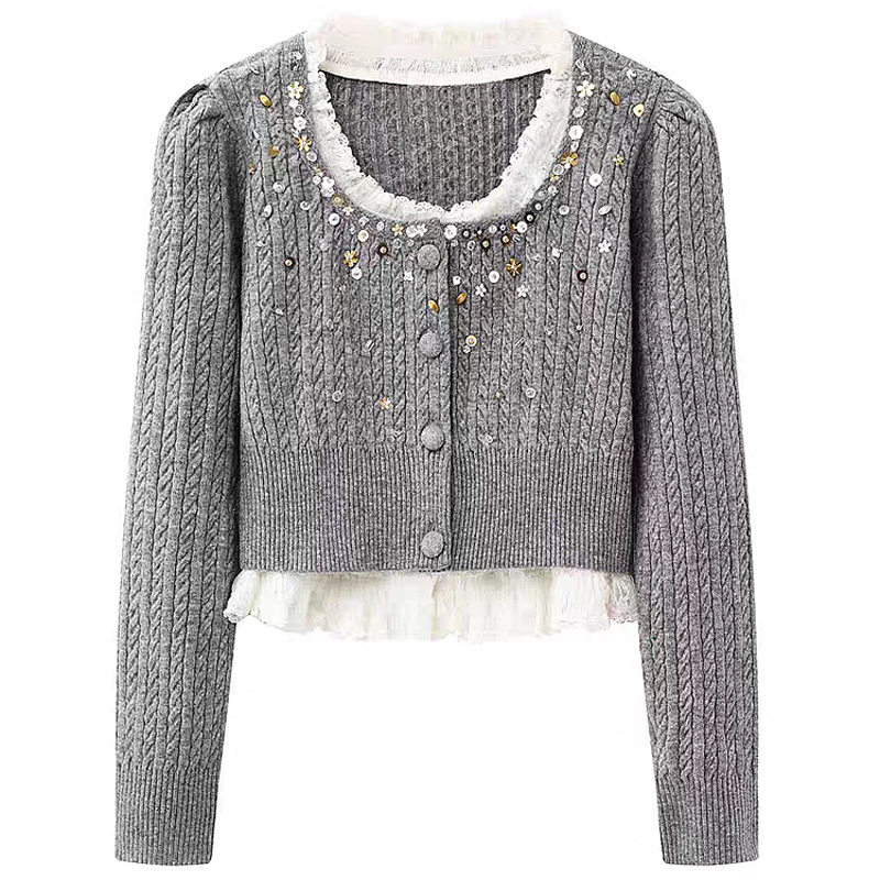 现货深圳南油2025冬女装重工钉珠蕾丝拼接假两件长袖短款针织开衫