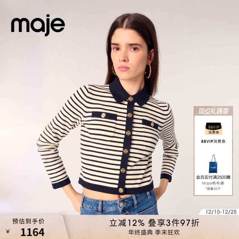 Maje2025秋冬女装法式时尚撞色条纹翻领单排扣长袖短款针织开衫