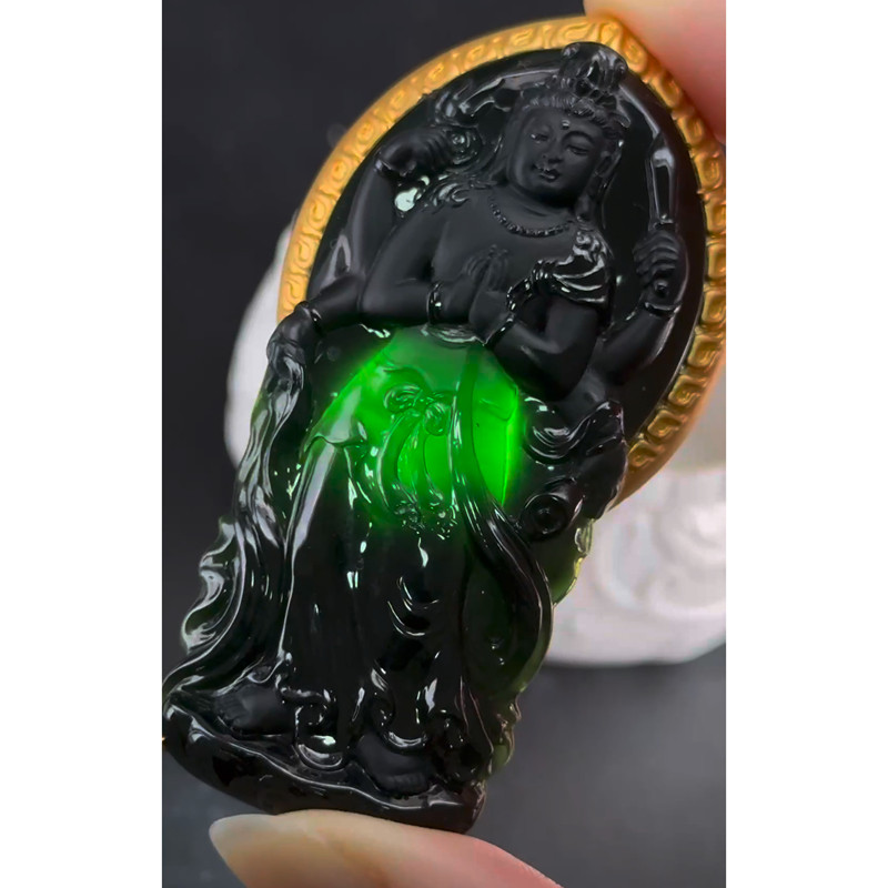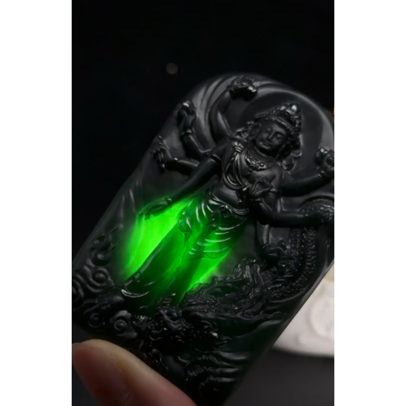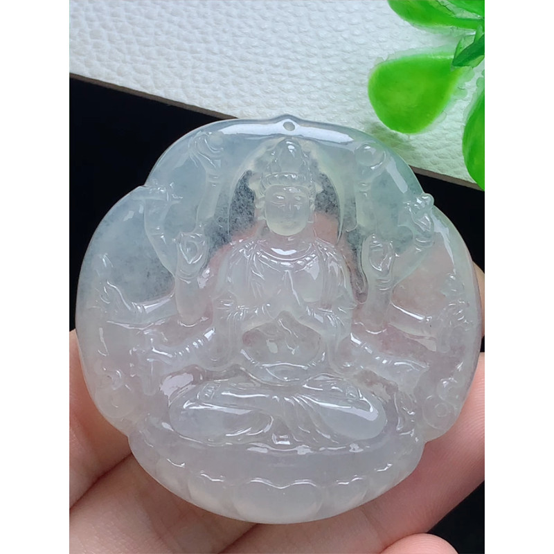 缅甸天然A货玉石翡翠 老坑精雕冰种 手工雕刻 飘花千手观音吊坠