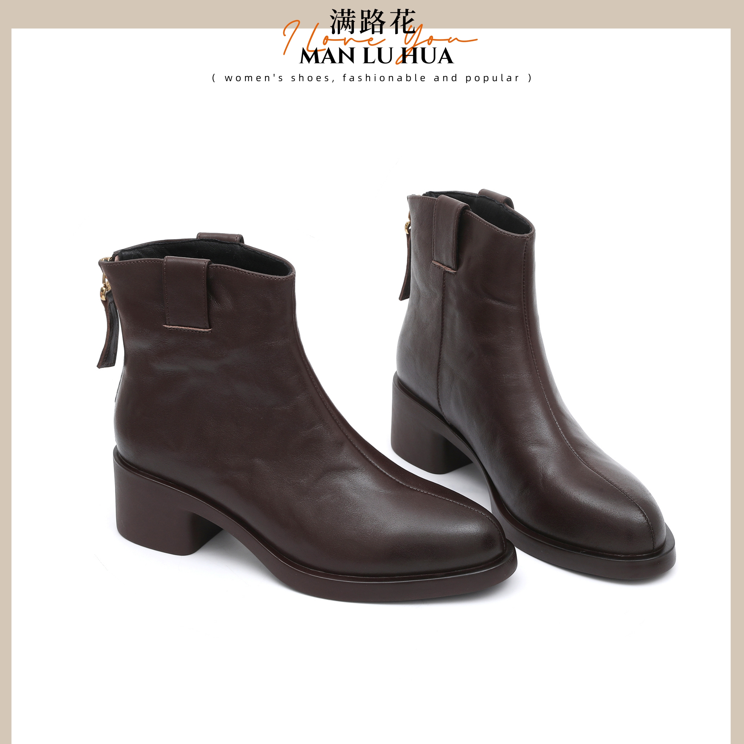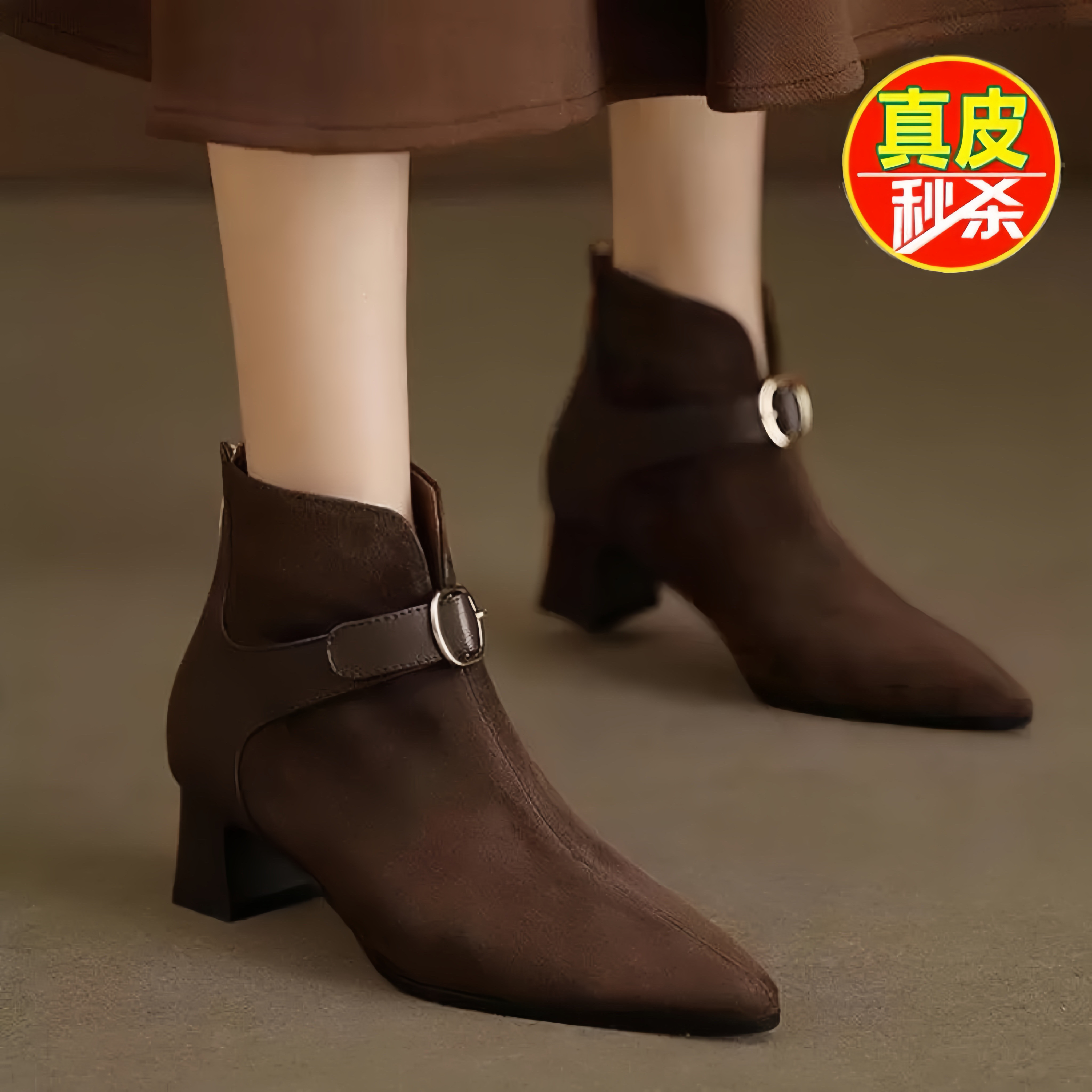 款复古粗跟显瘦尖头中跟短靴女2025秋冬新时装靴翻毛皮加绒马丁靴