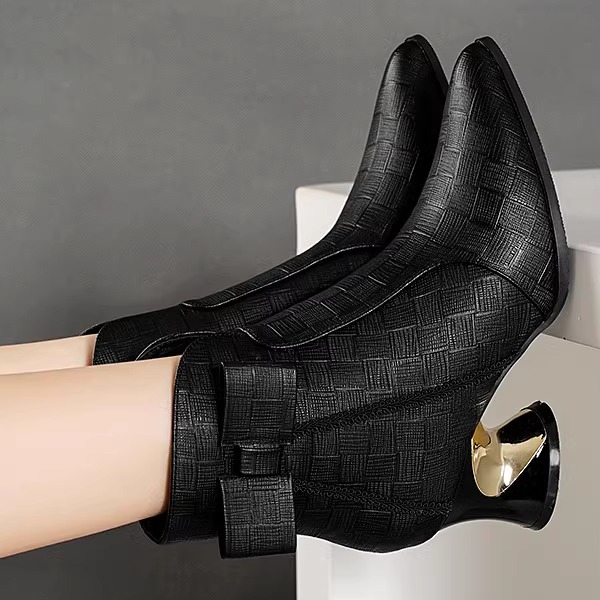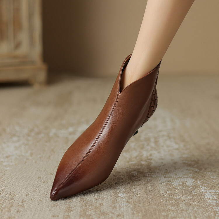 法式气质尖头中跟短靴女真皮编织高级感细跟裸靴冬后拉链春秋单靴