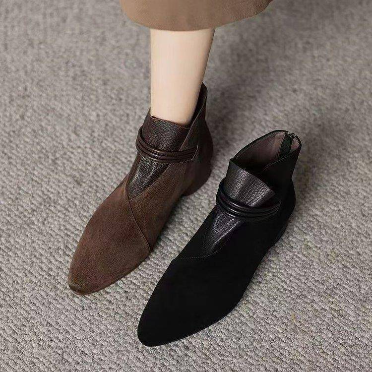 2025秋冬新款短靴女磨砂皮中跟粗跟短筒裸靴绒面尖头拉链加绒女鞋