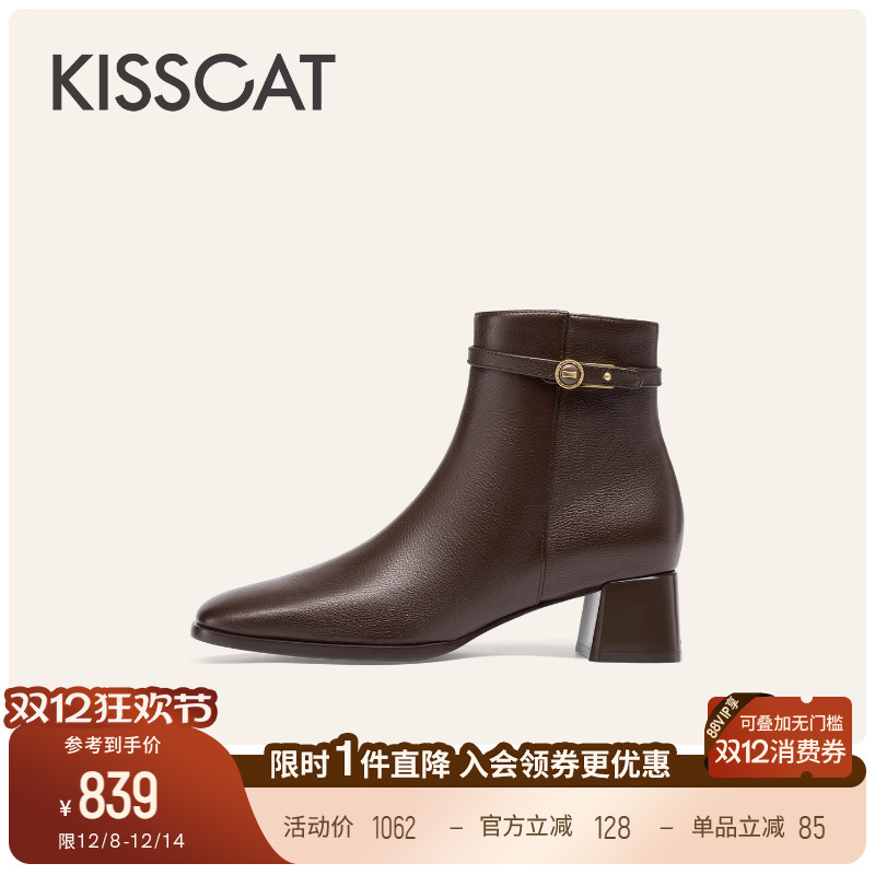 KISSCAT接吻猫[城市漫游]中跟靴25冬新真皮短靴尖头黑色时装靴女